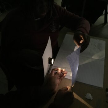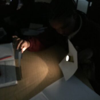The experiment helped students observe that when light from an object hits a surface, it changes direction—it bounces off at the same angle as it arrived. This principle, known as the law of reflection, was demonstrated as pupils compared shiny, dull, and textured surfaces to see which reflected the most light.